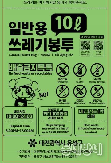정용래 유성구청장은 “이번 종량제봉투 디자인 변경으로 올바른 생활 쓰레기 배출 문화가 확산하길 바란다”라며 “앞으로도 쾌적한 도시환경을 조성하고 생활 속 친환경 실천이 정착될 수 있도록 노력하겠다”라고 말했다.