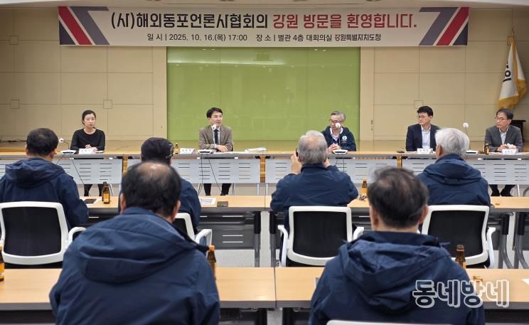 동네방네 김형규 기자 | 강원특별자치도는 10월 16일 도청을 방문한 (사)해외동포언론사협회(회장 김훈)와 간담을 갖고, 강원특별자치도의 비전과 주요 정책을 소개하는 한편 재외동포 사회와의 소통을 강화하는 시간을 가졌다.