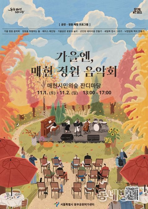 동네방네 김형규 기자 | 서울시는 서초구 양재동에 위치한 매헌시민의숲에서 다양한 음악을 즐기며 정원체험을 해볼 수 있는 ‘가을엔, 매헌 정원 음악회’를 11월 1일~11월 2일 오후 1시부터 5시까지 선보인다.