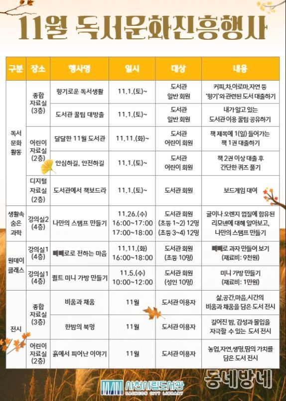동네방네 김형규 기자 | 사천시는 사천시립도서관에서 11월 한 달 동안 책과 함께 여유로운 시간을 보내며 감성을 채울 수 있는 다양한 독서문화행사와 체험 프로그램을 운영한다고 17일 밝혔다.