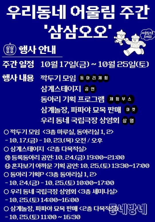 동네방네 김형규 기자 | 김해시 화정생활문화센터 어울림은 17일부터 오는 25일까지 ‘2025년 우리 동네 어울림 주간 - 삼삼오오’를 개최한다고 밝혔다.