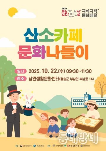 동네방네 김형규 기자 | (재)청송문화관광재단은 오는 10월 22일과 11월 25일 청송군 부남면 남관생활문화센터에서 2025 문화가 있는 날 '구석구석 문화배달' 사업의 일환으로 ‘산소카페 문화나들이’ 행사를 개최한다.