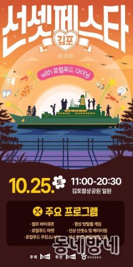 시 관계자는 “김포 선셋 페스타는 함상 석양을 배경으로 로컬푸드 미식과 문화 콘텐츠가 어우러지는 색다른 축제”라며 “안전하고 쾌적한 환경에서 시민과 관광객 모두에게 잊지 못할 경험을 제공하겠다”고 말했다.