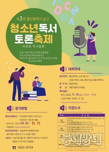 동네방네 김형규 기자 | 울산 남구는 청소년의 독서습관 형성과 건전한 토론문화 확산을 위해 오는 11월 15일 격동초등학교에서 개최하는‘2025년 제3회 울산광역시 남구 청소년 독서 토론축제’참가자를 모집한다고 밝혔다.