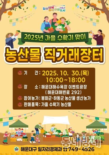 동네방네 김형규 기자 | 해운대구는 30일 오전 10시~오후 6시 해운대해수욕장 이벤트광장에서 ‘가을 수확기 맞이 농산물 직거래장터’를 연다.