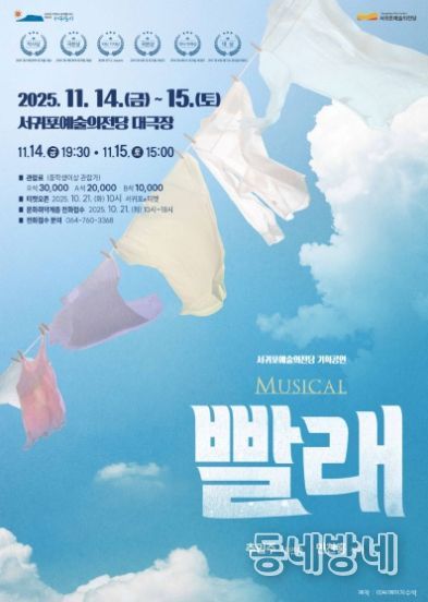 동네방네 김형규 기자 | 서귀포예술의전당은 오는 11월 14일 오후 7시 30분, 11월 15일 오후 3시, 이틀간 총 2회에 걸쳐 서귀포예술의전당 대극장에서 뮤지컬‘빨래’를 선보인다.