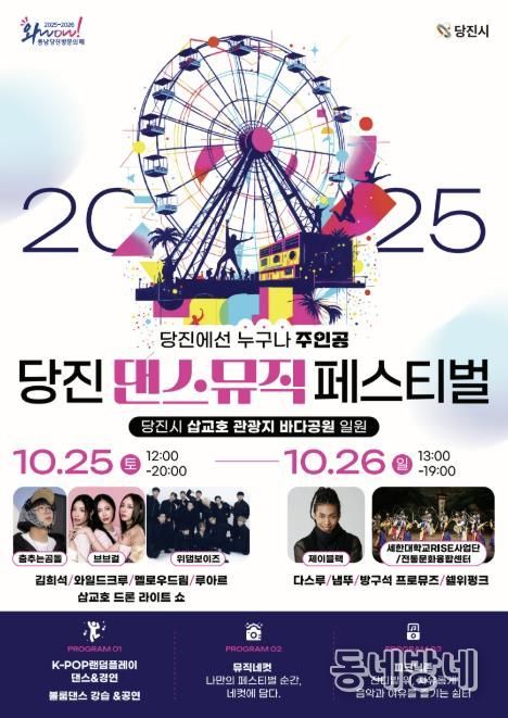 동네방네 김형규 기자 | 당진시가 오는 25일과 26일 이틀간 삽교호 관광지 바다공원 일원에서‘2025년 당진 댄스·뮤직 페스티벌(DDMF)’을 개최하며, '춤과 음악으로 하나 되는 당진, 당진에선 누구나 주인공'이라는 주제로 화려한 가을 축제의 장을 펼친다.