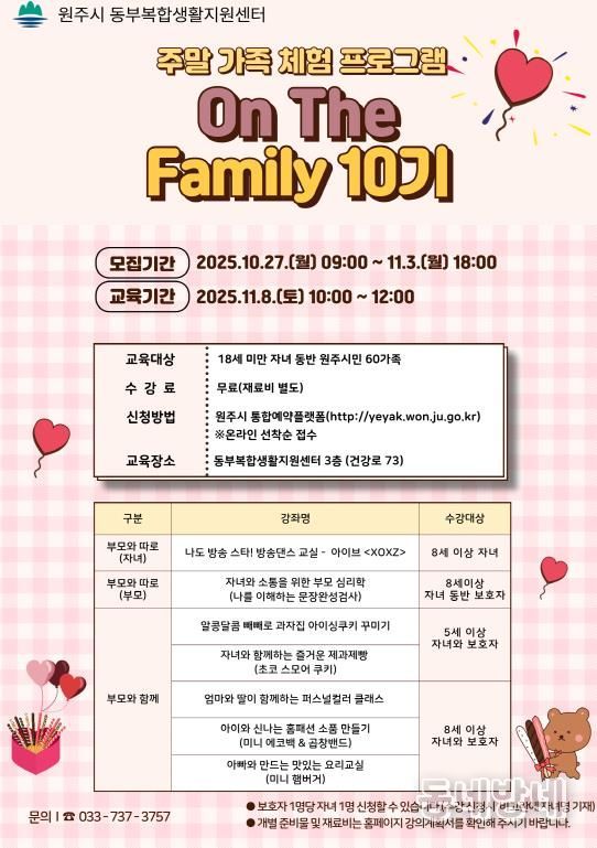 동네방네 김형규 기자 | 원주시 동부복합생활지원센터는 오는 11월 8일 주말 가족 프로그램 ‘온 더 패밀리(On The Family)’ 10기 과정을 운영한다.