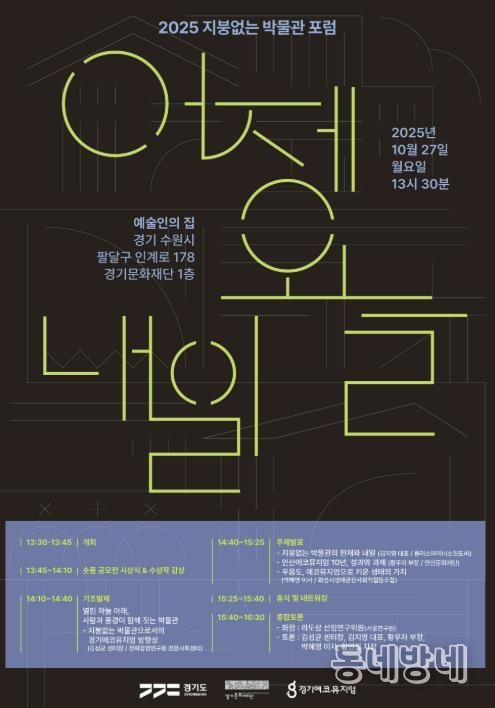 동네방네 김형규 기자 | 경기도와 경기문화재단은 일상 곳곳의 발자취를 ‘박물관’으로 만드는 지붕없는 박물관(경기에코뮤지엄)사업의 '2025 지붕없는 박물관 포럼_어제·오늘·내일'을 10월 27일 오후 1시 30분 경기문화재단 예술인의 집(수원)에서 개최한다.