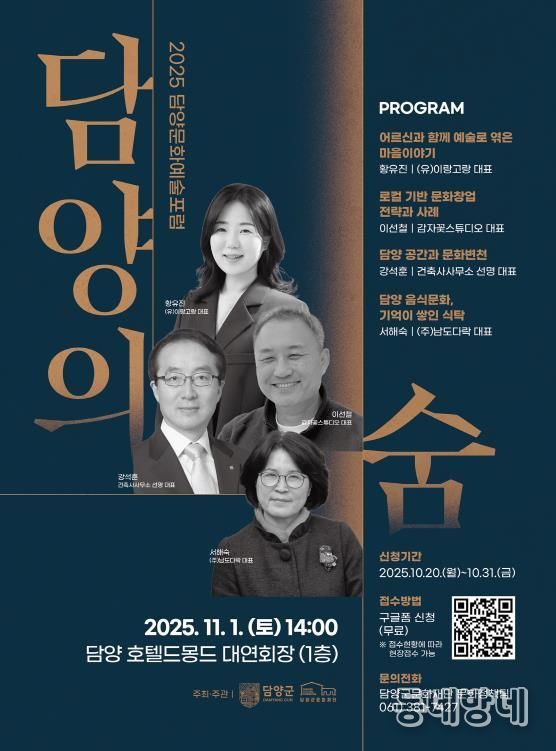 동네방네 김형규 기자 | 담양군문화재단은 11월 1일 토요일 오후 2시, 담양 호텔드몽드 대연회장에서 2025 담양 문화예술포럼 '담양의 숨'을 개최한다고 밝혔다.
