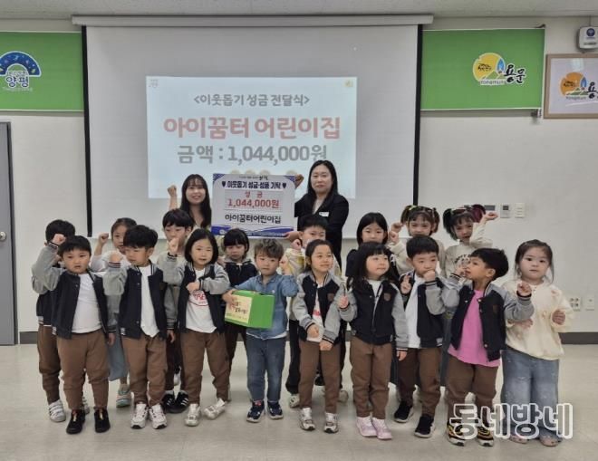동네방네 김형규 기자 | 양평군 용문면은 지난 20일 용문면 소재 아이꿈터 어린이집이 주최한 ‘소소한 기쁨, 특별한 만남, 행복 나눔 작은 장터’ 바자회를 통해 마련된 수익금 1,044,000원을 용문면에 기탁했다고 밝혔다.