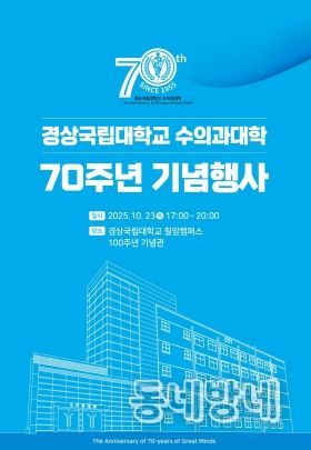 경상국립대학교 수의과대학은 설립 70주년을 맞이하여 70년 개척의 역사를 바탕으로 미래 100년을 향한 새로운 비상을 기념하기 위해, 10월 23일 오후 5시 칠암캠퍼스 100주년 기념관에서 ‘70년 개척의 자부심, 100년을 향한 새로운 비상’이라는 슬로건으로 ‘경상국립대학교 수의과대학 70주년 기념행사’를 개최한다.