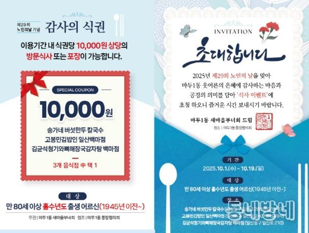 행사는 어르신들이 선호하는 지역 식당 3곳을 선정하고, 기간 내 자유롭게 식사를 할 수 있는 식사권을 나눠주는 방식으로 진행됐다.
