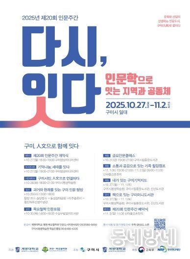 동네방네 김형규 기자 | 구미시에서는 한국연구재단(교육부)과 구미시가 공동으로 지원하고 계명대학교 목요철학원이 주관하는 인문도시조성지원사업의 일환으로 오는 10월 27일부터 11월 2일까지 일주일간 제20회 인문주간을 운영한다.