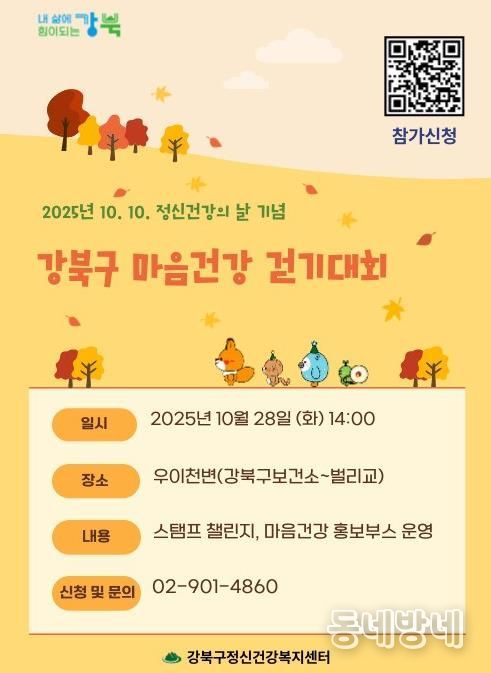 동네방네 김형규 기자 | 서울 강북구는 오는 28일 오후 2시부터 4시까지 정신건강의 날 기념 마음건강 걷기대회를 개최한다.