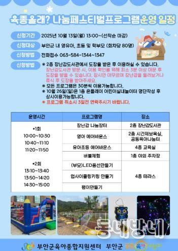 자세한 참여 방법과 일정은 카카오채널 ‘부안육종올래’ 홍보 포스터 및 부안군 육아종합지원센터를 통해 문의할 수 있다.