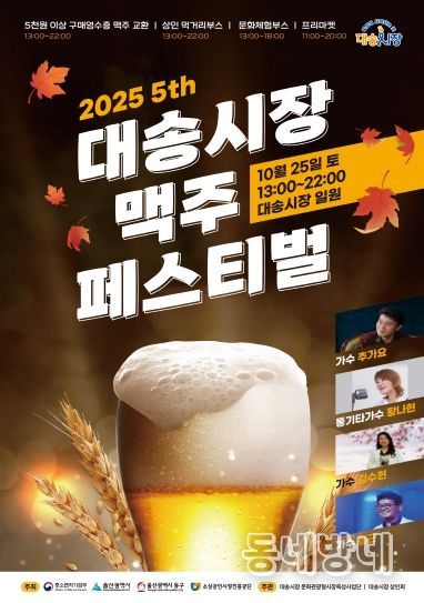 동네방네 김형규 기자 | 울산 동구는 오는 10월 25일 토요일 오후 1시부터 오후 10시까지 대송시장 일원에서 ‘10월 대송시장 맥주 페스티벌’을 개최한다고 밝혔다.