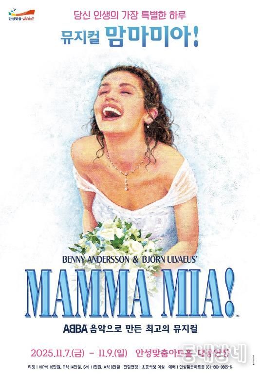 동네방네 김형규 기자 | 안성맞춤아트홀은 오는 11월 7일부터 9일까지 대공연장에서 세계적인 히트 뮤지컬 '맘마미아!'를 무대에 올린다. 세대를 초월한 명곡과 유쾌한 스토리로 사랑받아온 이번 작품은 남녀노소 누구나 즐길 수 있는 최고의 힐링 뮤지컬이다.