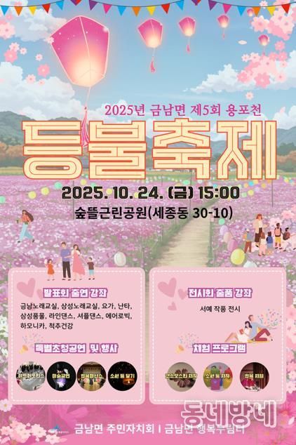 동네방네 김형규 기자 | 세종특별자치시 금남면 주민자치회가 24일 숲뜰근린공원 코스모스 꽃밭(세종동 30-10) 일원에서 ‘제5회 용포천 등불축제’를 개최한다.