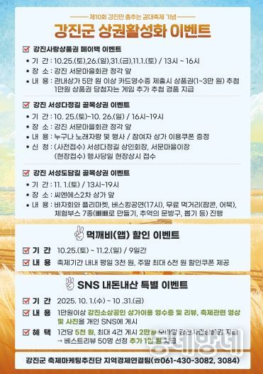 이번 이벤트는 상가 방문객 및 소비 촉진을 유도해 진읍 골목상권의 활력을 불어넣기 위해 진행되며, 주요 이벤트로는 강진사랑상품권 페이백 이벤트, 강진 서성다정길 골목상권 이벤트, 강진 서성도담길 골목상권 이벤트, ‘강진맛깨비’ 먹깨비 할인 이벤트, SNS 내돈내산 특별 이벤트 등이 있다.