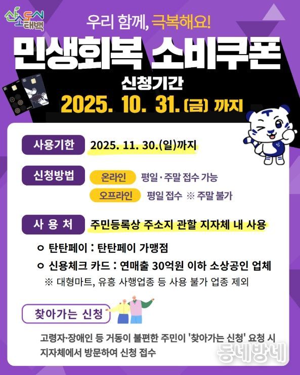 동네방네 김형규 기자 | 태백시는 2차 민생회복 소비쿠폰 신청 마감이 일주일 앞으로 다가오자, 아직 신청하지 않은 시민들에게 서둘러 신청할 것을 당부했다.