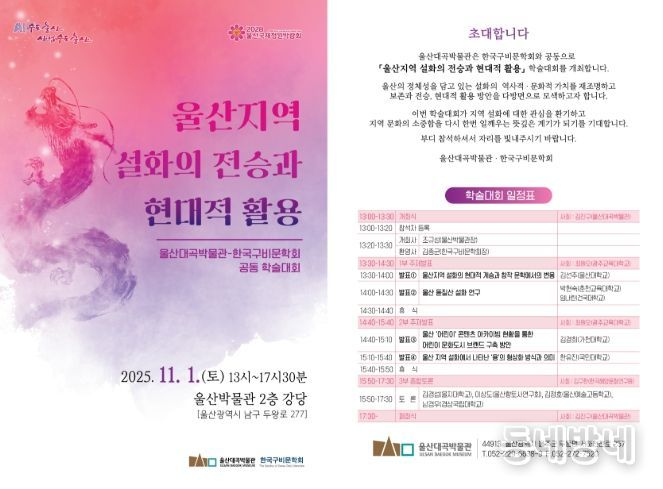 박물관 관계자는 “이번 학술대회는 연구자뿐 아니라 울산 설화에 관심 있는 시민이라면 누구나 무료로 참여할 수 있다”라며 “울산의 정체성을 담고 있는 설화 연구 성과를 함께 공유하는 뜻깊은 자리가 되길 바란다”라고 말했다.