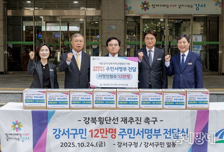 동네방네 김형규 기자 | 서울 강서구는 24일 강북횡단선 신속 재추진을 위한 12만 주민 서명부 전달식을 개최했다.