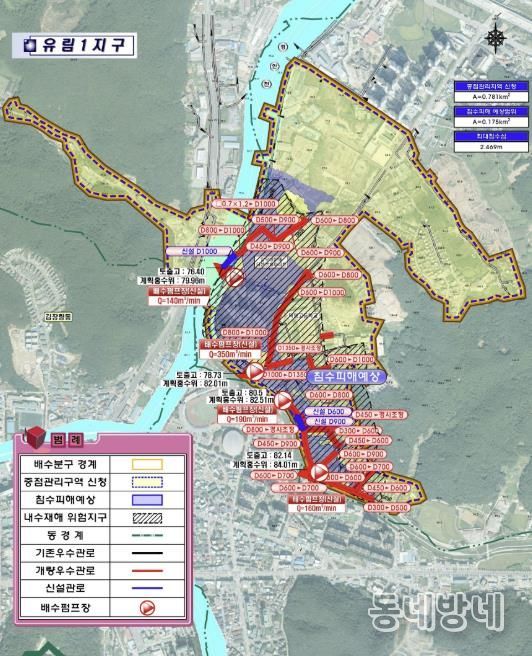 하수도정비 중점관리지역으로 지정된 ‘유림1지구 및 중앙지구’의 면적은 약 1.08㎢다. 이 지역은 하수관로의 통수 능력이 부족하고, 하천 수위가 상승할 경우 내수 배제가 어려운 지역으로 꼽혔다.