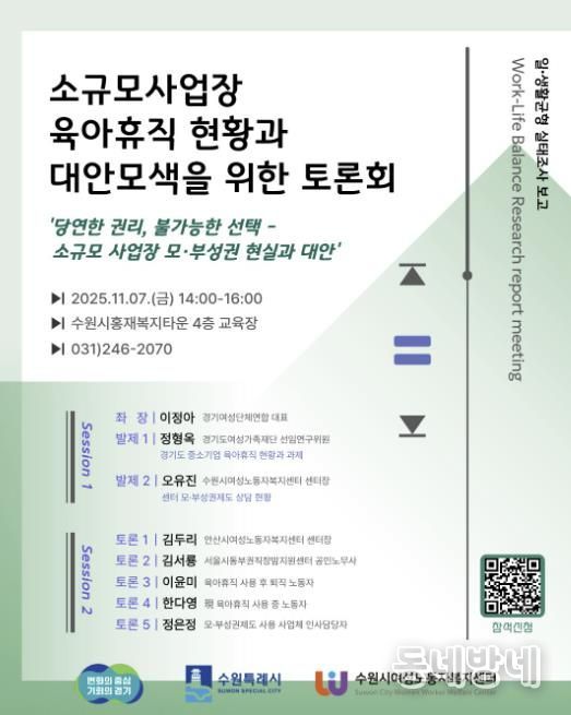동네방네 김형규 기자 | 수원시여성노동자복지센터가 11월 7일 오후 2시 수원시홍재복지타운 4층 교육장에서 열리는 ‘소규모 사업장 육아휴직 현황과 대안 모색을 위한 토론회’ 참가자를 모집한다.