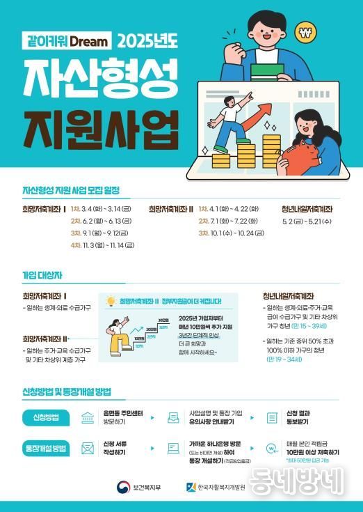 동네방네 김형규 기자 | 서울 용산구가 생계·의료급여 수급 가구의 자립을 돕고 근로 의지를 높이기 위한 ‘희망저축계좌Ⅰ’ 4차 신규 가입자를 11월 3일부터 11월 14일까지 모집한다고 밝혔다.