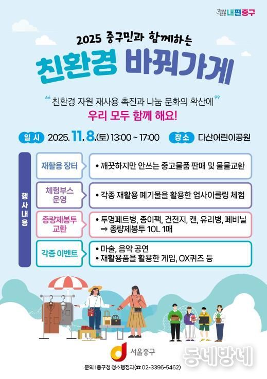 동네방네 김형규 기자 | 서울 중구는 오는 11월 8일 오후 1시부터 5시까지, 다산어린이공원에서 ‘2025년 중구민과 함께하는 친환경 바꿔가게’ 행사를 개최한다.