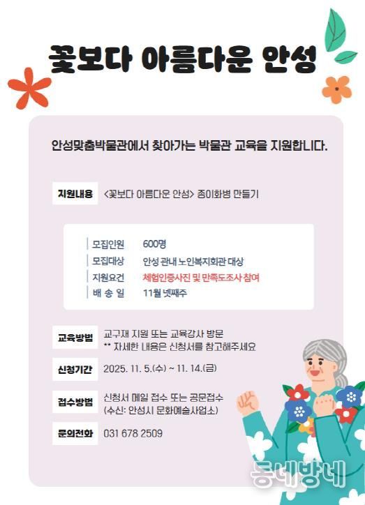동네방네 김형규 기자 | 안성시 안성맞춤박물관은 지역 내 문화 소외계층의 문화 향유 기회를 확대하기 위해 '안성맞춤박물관 찾아가는 박물관 교육'을 오는 11월 5일부터 11월 14일까지 신청받는다.