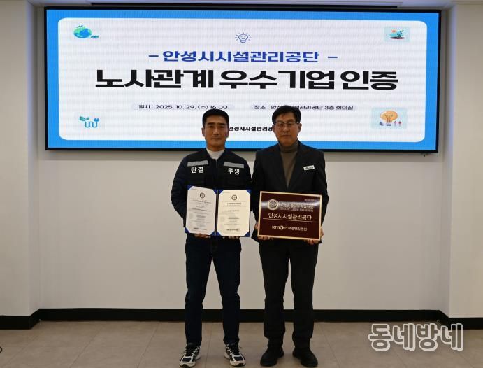 동네방네 김형규 기자 | 안성시시설관리공단은 안성시시설관리공단 노동조합과 함께 상생과 신뢰를 기반으로 한 모범적인 노사문화를 인정받아 ‘노사관계 우수기업’ 인증을 획득하했다고 밝혔다.