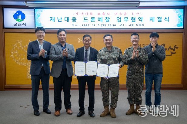 동네방네 김형규 기자 | 군산시와 제9585부대 1대대는 3일 군산시청에서 ‘드론 예찰활동 업무협약’을 체결하고, 재난·재해 예방과 지역 안전 강화에 협력하기로 했다.