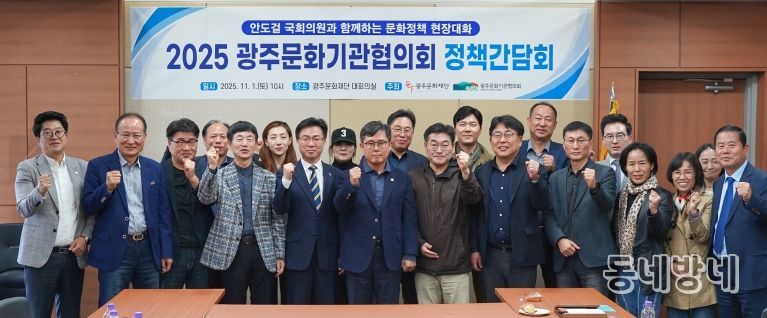 동네방네 김형규 기자 | 광주문화기관협의회(간사기관: 광주문화재단, 대표이사 직무대행 전은옥)는 11월 1일 오전광주문화재단에서 안도걸 국회의원(더불어민주당, 동구남구을)을 초청해 '2025 광주문화기관협의회 안도걸 국회의원과 함께하는 문화정책 간담회'를 개최했다.
