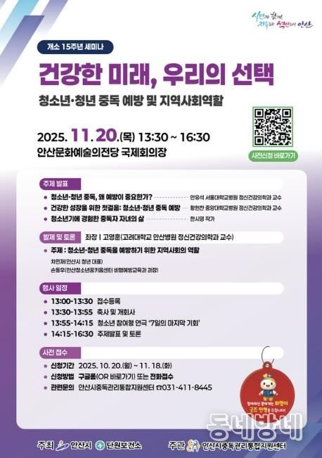동네방네 김형규 기자 | 안산시 중독관리통합지원센터는 오는 20일 안산문화예술의전당 국제회의장에서 개소 15주년을 맞아 ‘건강한 미래, 우리의 선택: 청소년·청년 중독 예방 및 지역사회역할’을 주제로 기념 세미나를 개최한다고 4일 밝혔다.