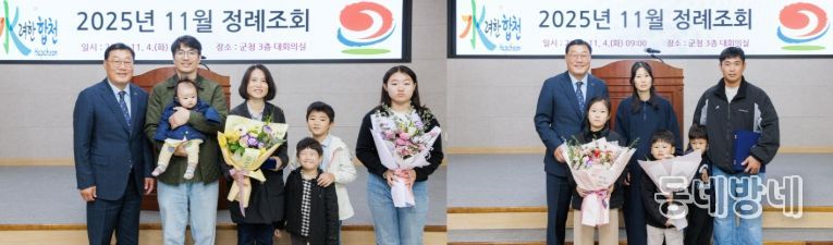 동네방네 김형규 기자 | 합천군은 지난 4일 군청 대회의실에서 열린 11월 정례조회에서 다자녀 모범 임산부 2명에게 표창패를 수여했다.