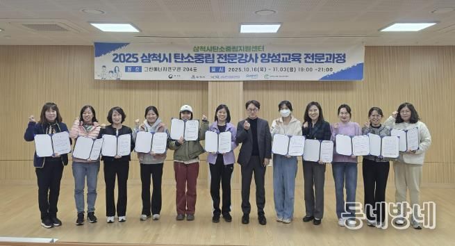 동네방네 김형규 기자 | 삼척시탄소중립지원센터는 11월 3일 오후 7시 강원대학교 삼척캠퍼스 그린에너지연구관에서 ‘2025 삼척시 탄소중립 전문강사 양성교육 전문과정’ 수료식을 개최했다.