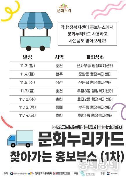 동네방네 김형규 기자 | 동해시는 문화누리카드 이용자들의 편의 증진과 이용 활성화를 위해 오는 11월 13일 오전 10시부터 오후 4시까지, 부곡동 행정복지센터에서 ‘문화누리카드 찾아가는 홍보부스’를 운영한다.