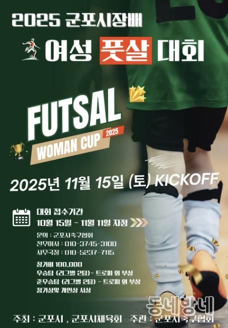 동네방네 김형규 기자 | 군포시는 여성 생활체육 참여 확대와 건전한 스포츠 문화 확산을 위해 ‘2025 군포시장배 여성 풋살대회’를 오는 11월 15일(토) 군포시 국민체육센터 축구장에서 개최한다.