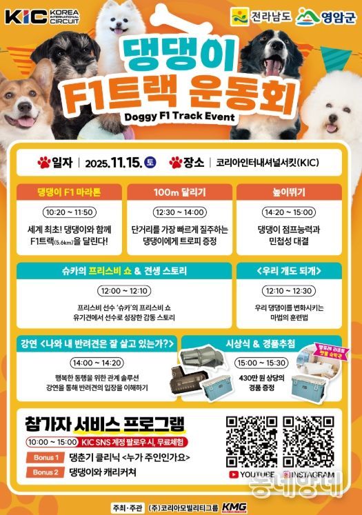 동네방네 김형규 기자 | 전라남도는 국제자동차경주장 관리운영을 맡은 ㈜코리아모빌리티그룹이 오는 15일 반려문화 확산을 위해 반려견과 함께 F1트랙을 달리는 ‘2025 댕댕이 F1트랙 운동회’를 개최한다고 밝혔다.