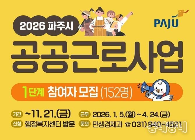 동네방네 김형규 기자 | 파주시는 오는 21일까지 2026년 1단계 공공근로사업 참여자 152명을 모집한다고 밝혔다.