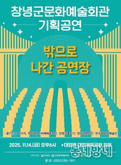 동네방네 김형규 기자 | 창녕군은 오는 14일 오후 6시부터 7시 30분까지 특별 기획 공연‘밖으로 나간 공연장’을 대합면 체육공원 일원에서 개최한다.