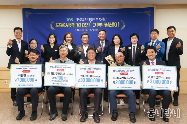동네방네 김형규 기자 | (재)광양시어린이보육재단은 지난 11월 7일 광양시청 만남실에서 정인화 광양시장, 이광용 이사장, 기탁자 등 20여 명이 참석한 가운데 보육사랑 100인+ 기부 릴레이 후원금 기탁식을 개최했다.