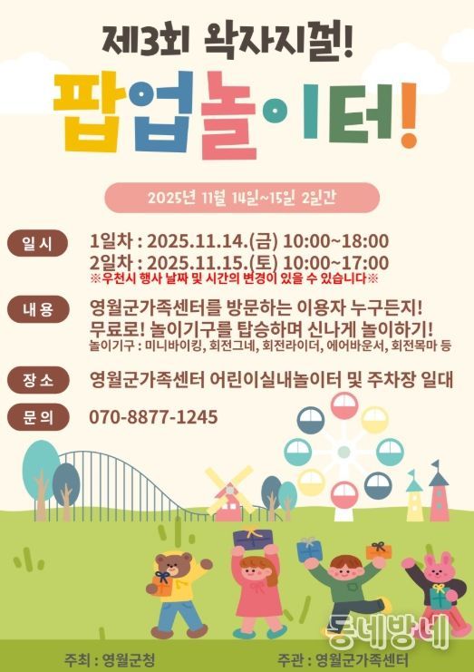 동네방네 김형규 기자 | 영월군 가족센터는 오는 11월 14, 15일 ‘제3회 왁자지껄 팝업놀이터’를 운영한다.