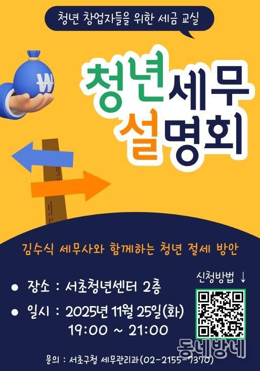동네방네 김형규 기자 | 서울 서초구는 오는 25일 19시 서초청년센터에서 '청년 창업자를 위한 세금 교실'을 주제로 청년 세무설명회를 개최한다. 이번 설명회는 창업 초기 단계에서 세무·회계 문제로 어려움을 겪는 청년 100여 명을 대상으로 절세 방안 등 해결책을 제시하기 위해 마련됐다.