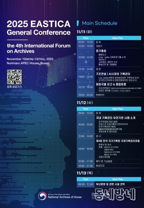 동네방네 김형규 기자 | 행정안전부 국가기록원은 11월 10일부터 13일까지 부산 누리마루 APEC 하우스에서 '2025년 동아시아기록관리협의회(EASTICA) 정기총회 및 제4회 한국 국가기록원 국제기록관리포럼'을 개최한다고 밝혔다.