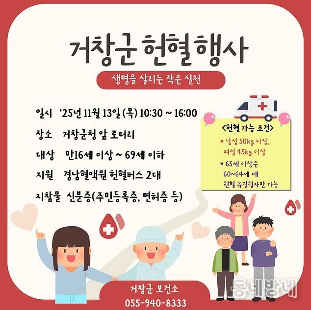 동네방네 김형규 기자 | 거창군은 오는 13일 오전 10시 30분부터 오후 4시까지 거창군청 앞 로터리에서 ‘2025년 마지막 생명나눔 헌혈 행사’를 실시한다.