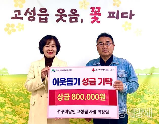 동네방네 김형규 기자 | 고성군 고성읍는 쭈꾸미달인 고성점 최창림 사장이 11월 11일, 관내 어려운 이웃들에게 전달해달라며 ‘전국노래자랑 고성편’에서 인기상 수상 상금 80만 원을 저소득층을 위해 기탁했다.