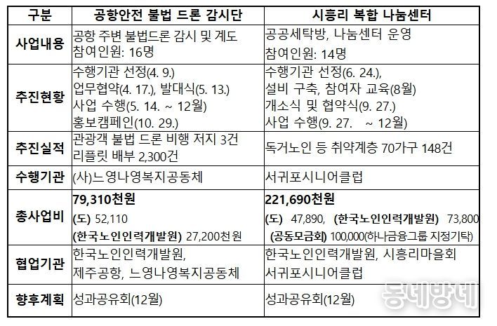 올해는 ㈔느영나영복지공동체, 한국공항공사 제주지역본부와 협력해 공항 주변 드론 비행금지 구역을 순찰·계도하는 ‘공항안전 불법드론 감시단’을 운영했다. 이 사업은 보건복지부 주관 ‘2026년 전국확산 모델 아이템’으로 선정되는 성과를 거뒀다.